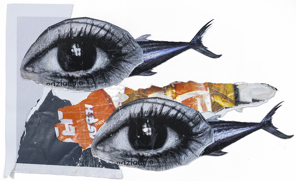 Artwork: Kellie O’Dempsey, Two Eye Fish, 2023, Collage and mixed media drawing on 300gsm acid free rag matte paper, 79 x 48cm (framed).