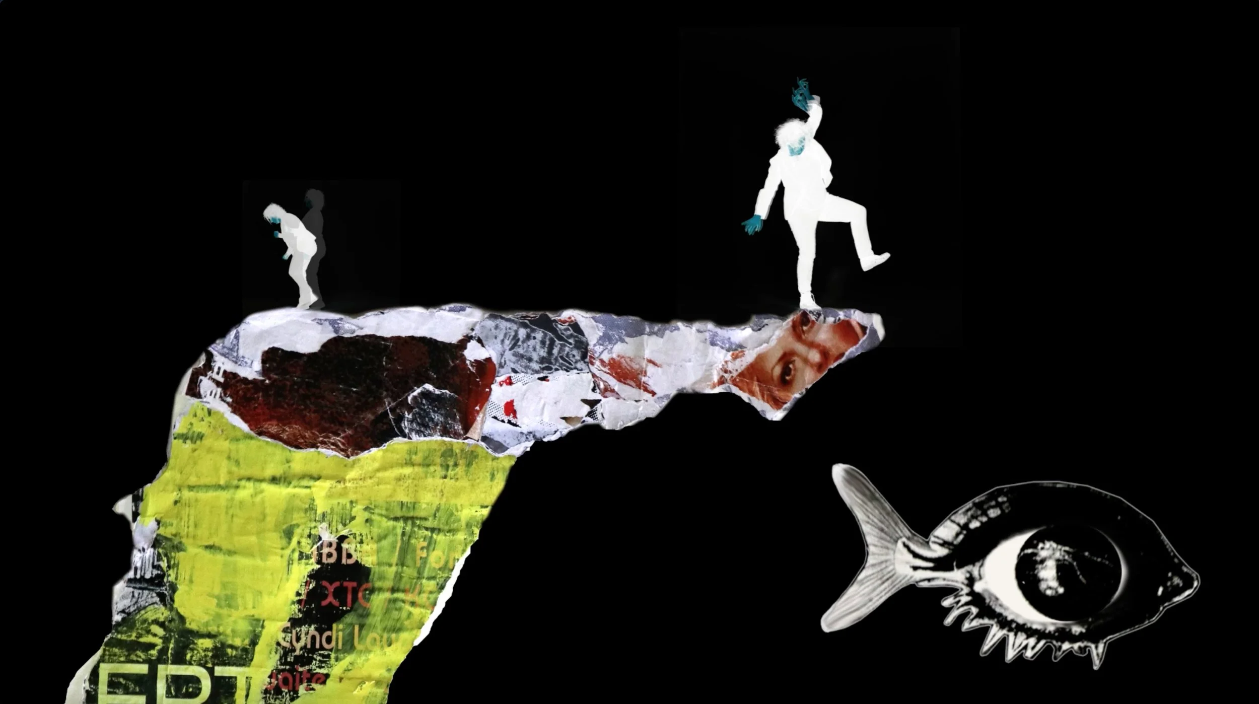 Wish You Were Here transforms the quiet and contemplative white cube into a glowing, moving, soundtracked landscape. Entering its space is an invitation to move through a world of psychedelia: to be bathed in dynamic neon, buoyed by its beat, and caught within its projections. In this uncanny dreamscape mash, schools of surreal eye-fish swim above land. Our gaze meets theirs: surveilling, unblinking. Collages layer together gestural marks, human snippets, and deftly-excised forms, conjuring figures both here and not here. Soft pastel materialities, nondescript hues, a generosity of white space, and ripped edges heightens their connotations of absence and erasure. Amongst it all is the artist’s immediately-recognisable silhouette (that hair, that cut-of-her-cloth).